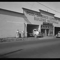 Black and white image of a large building with a stair-step false front. Two garage doors open out on either side of a central area with display windows and a recessed entrance. Four men stand at the image left of the building, three in overalls with aprons and one in business pants and a dress shirt. One truck is parked half in and half out of the garage door next to them, and another truck is parked along the curb in front of the main entrance. Signs on the store indicate that it sells building materials and Fuller paints. Screen doors and window screens lean against the display windows. This images was part of the Herbert McMullen bequest. McMullen was a local photographer who also collected other images of daily life in the area.