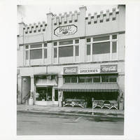 Black and white image of a two-story building with a produce stand and a barber shop taking up its the lower floor. The upper floor has three windows, one with the number 1909 in the upper clerestory window. The upper roofline of the building features crenellations, giving it the appearance of castle towers. Beneath the central and highest pediment is a logo which reads, 'K of P, F.C., no. 34.' Coca cola advertising dominates the grocery store signage, while two men in barbering shirts watch from the windows of the barber shop next door.