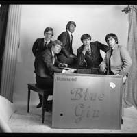 Black and white image of a group of men gathered around a piano in a studio. One young man sits on a bench in front of the piano keyboard, with another standing behind him. The young man in the center of the group sits on the piano, while the remaining two lean against the piano body with their elbows supporting them. Four of the young men wear short, dark patterned suit coats over dark slacks, while the fifth wears a light colored suit jacket and light pants. All wear ties and light shirts. Their hair is long and parted on the side and combed over. A board in front of the group identifies them as the 'Blue Gin' band, with a five playing cards arranged in formation at the upper image right of the sign. 'Hammond' is printed at the top of the sign, but may indicate the Hammond piano company as a sponsor of the group.