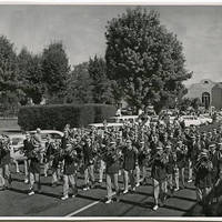 Black and white image of a high school band marching down Second Street by the Washington County Courthouse. The band's uniforms are military in appearance, with light pants, dark jackets, and pilots' caps. Most of the band members wear braids on their shoulders.