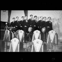 Black and white image of a group of men in black suits with bow ties standing in a row behind their instruments and music stands. Alto and soprano saxophones, a drum set, and a piano are set up in front of the group. According to museum records, this group was a dance band.
