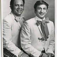 Black and white portrait of two men, seated. Both men appear to wear the more modern traditional 'traje de charro' costume of the mariachi musician: fitted pants with elaborate decoration, especially along the side seam, and short, fitted jackets decorated with elaborate silver buttons. White shirts and large, striped bow ties complete their costume. See also WCMpic_014506.