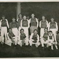 Black and white image of a group of men in baseball uniforms. Their uniforms are dark shirts with white sleeves and white pants. One man to the side is in street clothing and appears to be holding an umpire's mask. Another man in a white shirt and dark pants stands at the other end of the back row. A small blonde girl is seated on the lap of one man. Her clothing matches that of the baseball team, consisting of a dark shirt with white sleeves and Peter Pan collar and a white skirt and white cowboy boots. The picture was taken at night, and other people can be seen standing about in the background. This image was part of the Herbert McMullen bequest. McMullen was a local photographer who also collected other images of daily life in the area.