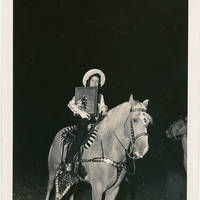 Black and white image of a woman on a Palomino horse holding a large plaque. The horse is outfitted with a Western saddle and other riding gear. Ms. Nestlin was part of a demonstration of horsemanship organized as part of the Rose Festival. This was the first year such demonstrations had been part of the festivities, and most if not all of the horsemen and women involved came from Washington County.
