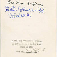 [back] [pen] Plac [sic] presented Rose Show 6-6/7-46. Neslin (Chuck's wife), Wash Co #1. [stamped] Photo Art Commercial Studios, 420 S.W. Washington St. Portland, Ore. Phone BR 54ss. Photo no. [pencil] R-11615-5.