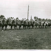 Black and white image of a group of men on horseback. The men wear uniforms and all have their hats raised in one hand. The horses are arranged in a line across an empty field, and all the men are riding Western style saddles. In the center roof the group three men hold the Oregon flag, the United States flag, and a banner stating that this is the Washington County Sheriff's Posse. The Rose Festival in Portland included demonstrations of horsemanship and group riding drills for the first time in 1946, and the Washington County Sheriff's Posse was one of the groups who participated in the show.