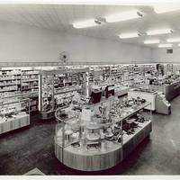 Black and white image depicting the interior of a store selling jewelry, silver coffee service, clocks, perfumes, and many other goods. A grill section is just visible in the back of the store. Abendroth Jewelers was located on Main Street in Hillsboro and was owned and operated by Fritz Abendroth.