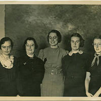 Yellowed black and white image of five women standing in a row. All wear dresses of varying styles. Their hair is shorter and curled on the bottom. Three of the women wear glasses. Museum records identify these women as employees of Commercial National Bank, which occupied the building where the U. S. Bank is now in downtown Hillsboro, on the corner of 2nd and Main Streets.