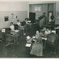 Black and white image of five different women seated at desks. One woman sits at a typewriter, while the woman behind her appears to be working with paper accounting material. The three women on the left side of the image all sit before accounting machines, which performed typewriting, ten-key, and other computational functions necessary for keeping track of banking transactions. Considered early forerunners of the modern computer, machines like this were replaced with business computers in the 1960s and 1970s. Museum records identify these women as employees of Commercial National Bank, which occupied the building where the U. S. Bank is now in downtown Hillsboro, on the corner of 2nd and Main Streets.