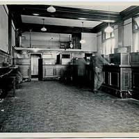 Black and white image of the interior of a bank, with ghostly figures standing at the tellers' stations. Electric lights hang from the ceiling, and spittoons stand on the floor beneath a counter. Commercial National Bank was built in the 1930s. The building was torn down and replaced in the 1950s with what is currently (2012) the U. S. Bank building in Hillsboro, at the corner of Main and Second Streets.