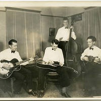 Black and white image of four men with string instruments. One man on the right of the image plays a ukulele, while next to him a man plays a lap steel guitar. The third man has a large guitar, while in the background a man plays an upright bass. The photo appears to have been taken inside someone's home. All four men wear dark pants, white shirts, and bow ties. This image was part of the Herbert McMullen bequest. McMullen was a local photographer who also collected various images of daily life in the area.