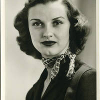 Black and white photo of a young woman. Her chin-length hair is softly curled, parted on the side and held back away from her face. She wears a dark suit coat with a geometric print scarf tied around her neck. This image is part of the Herbert E. McMullen bequest. McMullen was a local photographer who also collected images of local life from other photographers.