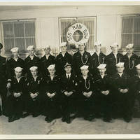 Black and white image of a group of young men in sailor style uniforms, arranged in two rows in front of a wall. Hanging on the wall is a lifebuoy on which is printed 'S. S. S. Rain Bow.' Sea Scouts are a part of the Boy Scouts of America, intended to provide activities and a learning experience for older boys. Hillsboro's troop was established in 1934, and at the time of this photo was led by 'Skipper' Roy L. Burnett, the man standing at the left of the group depicted here. This image is part of the Herbert E. McMullen bequest. McMullen was a local photographer who also collected images of local life from other photographers.