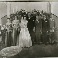 Black and white image of a wedding party consisting of the bride and groom, three groomsmen and two bridesmaids. The groom wears a sailor's uniform with two stripes on his upper shoulder; the bride wears a long white dress with a hoop underneath it and a long train. The bridesmaid's dresses match the bride's only with less lace and short sleeves. The groomsmen each wear a double-breasted suit. The party stands in front of an arrangement of flowers and candles. This image is part of the Herbert E. McMullen bequest. McMullen was a local photographer who also collected images of local life from other photographers.