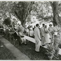 Black and white image of a couple standing on a white walkway in front of a pastor, with a seated audience watching. Trees shade the area, and a concrete sidewalk runs just to the side of the group. The bride wears an ankle-length, full skirted dress while the groom and groomsmen wear light-colored suits. Museum records do not identify this gathering, but it is included with a large number of other wedding photos that are part of the Herbert E. McMullen bequest. McMullen was a local photographer who also collected images of local life from other photographers.