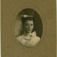 Black and white image of a young woman in a mat. The young woman's hair is pulled loosely up and back from her face and a large bow sits on top of her head. She wears a white blouse with a high neck and a large bow tied around the neck. A small locket hangs around her neck.