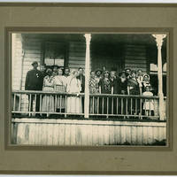 The students of the Scoggins Valley School stand on a porch while dressed in a variety of costumes.
