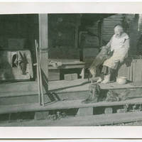 Portrait of Annie Wren, sitting on her porch with two dogs and a cat.