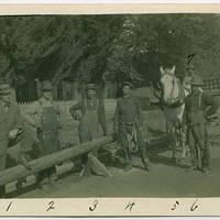 Six men stand with a horse and wagon, next to a telephone poll. They were part of the North Plain Phone Company crew.