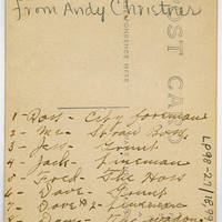 [back] North Plains Phone Company; 1 - Ross - City foreman; 2 - Me - [Straw?] Boss; 3 - Jess - Grunt; 4 - Jack - Lineman; 5 - Fred - The Hoss; 6 - Dave - Grunt; 7 - Dave #2 - Lineman; 8 - Dam - The wagon.