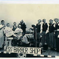 Parade float featuring the Flushers barbershop quartet group. The float includes a barbershop scene, with Hillsboro barber Wess Hebron.