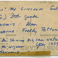 [back] 'new' old Lincoln School (F. G.) 3rd grade; Nakomis: man; Hiawatha: Freddy Patton; '...by the shining big sea water stands the wigwam of Nakomis...' year 1909