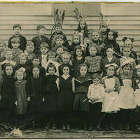 Group portrait of the 3rd grade class at Lincoln School in Forest Grove, Oregon. See WCMpic_019215 for another portrait of the three children in the back row, who are dressed as Native Americans.