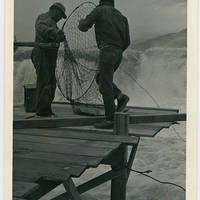 Two men hold a large net as they prepare to use if for fishing.