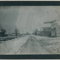 Scene of a street in Beaverton during the winter, showing a church and a market, among other buildings.