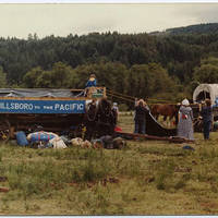 Photograph of several women and young children gathered around a wagon, with a covered wagon in the background. The wagon in the foreground has a banner reading 'Hillsboro to the Pacific.'