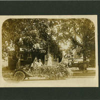 Black and white image of three young girls standing with a car covered almost entirely decorated in greenery. Two girls in light colored dresses, one with a large bow in her short hair stand beside the car. Another girl standing in the car wears a crowned and a sleeveless robe with a rope belt. She leans against a pole holding a United States flag. In the background behind two trees is a small shingle-style house with a porch and a delivery truck with a man sitting in the driver's seat.
