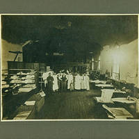 Black and white image of a group of workers in a laundry. Five men, a young boy, and three women in skirts and long sleeved shirts stand in a large room with a variety of laundry equipment. Baskets of clothing sit along the left of the image next to a counter and shelves of folded material. Clean shirts hang on a rack behind the group of people, and other clothes hang at the back of the room. A row of ironing boards and irons fills up the right side of the image, and a pile of wood can be seen outside of an open window.