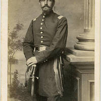 Sepia-toned portrait of a young man with a long goatee and full mustache wearing the uniform of a junior officer, possibly a Lieutenant, in the Union Infantry during the Civil War. His long frock coat has a single row of buttons and shoulder boards, and he wears both a belt and a sash at the waist. He has a pistol in his belt holster, and his hands rest upon a sword. There is a single stripe down the side of his dark pants. His kepi has the curled bugle of the Infantry on the front. He stands beside a classically styled pillar and the background behind him is romantically rural. This photo was included in a collection donated by a Forest Grove resident, Ruby Bamford. The Bamford family was from England, but lived in Illinois during the Civil War. They settled in the Gales Creek area in the early 1880s. It is not known whether the photos belonged to the Bamfords or to Mrs. Bamford's natal family before their donation. See WCMpic_015180, WCMpic_015186, WCMpic_015187, WCMpic_015188, WCMpic_015191, WCMpic_015192, WCMpic_015194, WCMpic_015196, WCMpic_015198, WCMpic_015201, and WCMpic_015200 for other images from this collection.
