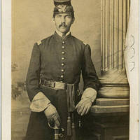 Sepia-toned portrait of an officer with a full, drooping mustache, wearing the uniform of the Union infantry during the Civil War. He wears a junior officer's frock coat with shoulder bars and a belt and dark-colored sash about his waist. He rests on gloved hand on the hilt of his sword, which stands point down in front of him, while he leans against a classically styled pillar with the other arm. His forage cap bears the insignia of the Infantry, and he stands in front of a soft, romantically styled rural background. This photo was included in a collection donated by a Forest Grove resident, Ruby Bamford. The Bamford family was from England, but lived in Illinois during the Civil War. They settled in the Gales Creek area in the early 1880s. It is not known whether the photos belonged to the Bamfords or to Mrs. Bamford's natal family before their donation. See WCMpic_015180, WCMpic_015185, WCMpic_015187, WCMpic_015188, WCMpic_015186, WCMpic_015192, WCMpic_015194, WCMpic_015196, WCMpic_015198, WCMpic_015201, and WCMpic_015200 for other images from this collection.