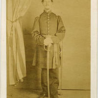 Sepia-toned portrait of a young man in the uniform of an officer from the Union Army during the Civil War. His long frock coat has a single row of buttons and shoulder boards, and he wears both a belt and a sash at the waist. The tip of his sword rests on the ground in front of him and his hands are folded over the hilt. His hair is somewhat long and combed back from his face. He stands against a plain backdrop with a United States flag draped and tied aside as if it were a curtain on his right. This photo was included in a collection donated by a Forest Grove resident, Ruby Bamford. The Bamford family was from England, but lived in Illinois during the Civil War. They settled in the Gales Creek area in the early 1880s.It is not known whether the photos belonged to the Bamfords or to Mrs. Bamford's natal family before their donation. See WCMpic_015180, WCMpic_015185, WCMpic_015186, WCMpic_015187, WCMpic_015188, WCMpic_015191, WCMpic_015192, WCMpic_015196, WCMpic_015198, WCMpic_015200, and WCMpic_015201 for other images from this collection.