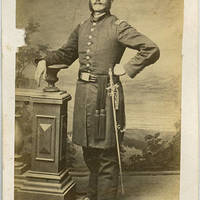 Sepia-toned portrait of a man wearing the uniform of a junior Union officer during the Civil War. He stands, one arm akimbo, the other resting on a pillar. His frock coat has shoulder bars and he wears a belt and a dark colored sash. What appears to be a Medical Service sword hangs from his belt, but the insignia on the front of his forage cap cannot be distinguished as to whether it is an 'M S' or 'U S.' His hair is long and curly, and combed back, and he wears a mustache and full muttonchops (sideburns). He stands in front of a soft, romantically styled rural background. This photo was included in a collection donated by a Forest Grove resident, Ruby Bamford. The Bamford family was from England, but lived in Illinois during the Civil War. They settled in the Gales Creek area in the early 1880s. It is not known whether the photos belonged to the Bamfords or to Mrs. Bamford's natal family before their donation. See WCMpic_015180, WCMpic_015185, WCMpic_015187, WCMpic_015188, WCMpic_015186, WCMpic_015192, WCMpic_015194, WCMpic_015196, WCMpic_015198, WCMpic_015201, and WCMpic_015191 for other images from this collection.