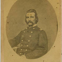 Sepia-toned portrait of a seated man wearing the uniform of a senior officer in the Union Army during the Civil War. Major General John A. Logan, known as 'Black Jack', was a veteran of the Mexican-American war and a successful lawyer before he resigned his congressional seat to serve as a volunteer in the Union Army. He was soon commissioned as a regular officer. Though it is doubtful that Logan himself autographed this particular image, such small 'souvenir' photos of well-known celebrities were popular in the 19th century as well as in modern times. This photo was included in a collection donated by a Forest Grove resident, Ruby Bamford. The Bamford family was from England, but lived in Illinois during the Civil War. They settled in the Gales Creek area in the early 1880s. It is not known whether the photos belonged to the Bamfords or to Mrs. Bamford's natal family before their donation, but since Logan himself was from Illinois, it is possible that whoever originally collected the photo served with or under Logan. See WCMpic_015180, WCMpic_015185, WCMpic_015186, WCMpic_015187, WCMpic_015188, WCMpic_015191, WCMpic_015192, WCMpic_015194, WCMpic_015198, WCMpic_015200, WCMpic_015212, and WCMpic_015196 for other images from this collection.