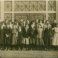 Black and white image of a group of students standing in front of a school building. A board in the left foreground states that the students are '7-8-9 Grade'. The girls wear knee-length dresses or skirts, gathered in at the waist and generally with long sleeves. Most of the clothes are made of dark colored material, but at least two girls wear white or light colored dresses. The girls wear their long and pulled back into long pony tails tied with large ribbons. The boys wear suits or pants and jackets over work clothes. Some of the boys have brogans, while the girls all appear to wear button up boots. Several adults stand in the rear of the group; the men wear suits with ties and the women wear blouses and skirts and their hair is mostly worn in the full, 'Gibson Girl' style. The group stands before the entrance to a large building that features windows with both vertical and horizontal and diagonal panes.