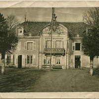 Sepia-toned image of a three-story European Manor home that appears to be in a rural combination of Romanesque and Beaux Arts architecture. The mansard roof features a guardrail along the roofline, and a large statue is elevated from the arched, carved pediment of the central section. Two dormers with rounded tops sit at either side of the main section. Shutters grace most of the windows, and a balcony dominates the second floor of the central section of the house. Two men can be seen standing in one open door; the yard is packed dirt and appears to have a regular driving route across it. A crude flagpole has been erected in the middle of the yard in front of the house, made up of a straight, tall log with all the limbs chopped off. Mary Morrissey Wunderlich, born in Washington County in the late 1880s, served in Europe as a nurse during World War I and is credited with taking this image. See WCMpic_015289 for what appears to be a rear view of this house, and WCMpic_015288 and WCmpic_015299 for other images credited to Mary Morrissey Wunderlich.