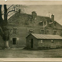 Sepia-toned image of a three-story European Manor home that appears to be in a rural combination of Romanesque and Beaux Arts architecture. The mansard roof features a guardrail along the roofline, and three dormers with rounded tops lie along the steeply sloped roof. Shutters grace most of the windows, and a small shed takes up the foreground of the image in front of the house. A man in a uniform with shoulder boards and a campaign hat stands in front of the shed, while men can be seen standing inside the smaller building and inside the open window at the left end of the house. The sign on the shed itself cannot be made out. Mary Morrissey Wunderlich, born in Washington County in the late 1880s, served in Europe as a nurse during World War I and is credited with taking this image. See WCMpic_015286 for what appears to be a front view of this house, and WCMpic_015288 and WCmpic_015299 for other images credited to Mary Morrissey Wunderlich.