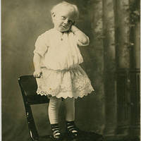Black and white portrait of a toddler in a short-sleeved white dress standing on a chair in front of a dreamy, hazy background. She wears a full white dress, belted just below the waist and bloused out. The skirt is mostly lace, and she wears white stockings and boots with numerous straps buttoned over the stockings. Her hair is short and fair, and a small pendant necklace hangs against the front of her dress.