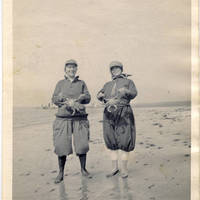 Black and white image of two young women standing on a beach, each holding a crab by its claws. The young women wear bloomers, and both appear to be wearing stockings and slippers. They each wear their hair tucked up underneath a cap (or possibly a bonnet). One wears a sweater and the other wears a light pullover jacket.