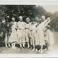 Black and white image of a group of women in dresses. They stand outside in what appears to be an orchard. The dresses the women wear are knee-length, several button in the front. All the dresses are short-sleeved and gathered at the waist. Four of the ladies wear hats, several of the women wear their long hair up in a bun. The photo is attached to an onion-skin paper with typewritten information about who is pictured in the image.