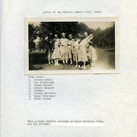 [front] [typed] Ladies of the Scholls Women's Club 1940s. From left-- 1. Jennie Larkin, 2. Ina Sutherland, 3. Grace Raynard, 4. Minnie Bennett, 5. hidden, 6. Minnie Bartlett, 7. Hazel Stretcher, 8. Mabel Groner. This picture donated courtesy of Mable [sic] Bartlett Olson, c/o Jim Allison.