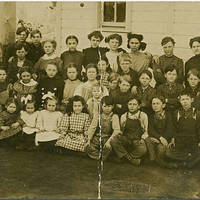 Sepia-toned image of a group of students gathered outside of Mountainside School, near Scholls Ferry. Built in 1875, this school was located on Hwy 219, just south of the current location of the Mountainside Cemetery. Though not specifically identified in this image, May Hansen was a student here and would have been eight years old at the time of this photo. This district was one of those consolidated to form Groner Elementary in the late 1940s. The man standing at the far right of the image is most likely the teacher, Henry Jack.