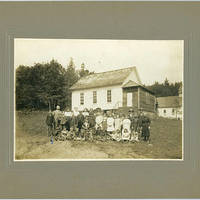 Sepia-toned image of a group of students gathered in front of a small, one-room school house with a church visible just beyond the building. The younger students, mostly boys, are seated on the ground, and the older students stand in three rows behind them. Most of the boys wear suit coats and many wear hats. The girls wear short dresses with puffed sleeves, most gathered at the waist. Watts School served students west of Forest Grove. See WCMpic_015632, WCMpic_015635, and WCMpic_015634 for other images of this school. The blue ink 'X' on the front may indicate that the small boy at the end of the row who is scratching his nose is the 'Roy Wilson' named on the back.