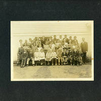 Sepia-toned image of a large group of students arranged in front of a two-story building. The younger students are seated in front, and the other students appear to be arranged on rises in the background. Most of the students appear to be grammar school age. the teacher, standing to the image right of the group, wears a double-breasted three-piece suit. The young boy indicated with the blue 'X' on his chest is Roy Wilson, the younger brother of Roy Wilson. Watts School served students west of Forest Grove. See WCMpic_015631, WCMpic_015635, and WCMpic_015632 for other images of this school.