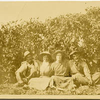 Sepia-toned image of two men and two women, seated on the ground in front of a row of bushes. They all wear hats; the men wear overalls and one wears a tie. The women wear loose dresses, gathered at the waist, and helmet style hats. The group each have an arm around the person(s) next to them.