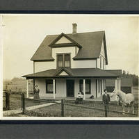Black and white image of a two story house with a large front dormer in a steeply pitched roof. A covered porch surrounds two sides of the house. Lace curtains hang in the windows and a large dog lays on the porch. Three people stand or sit in the front yard behind a wire fence. A woman stands on one side of the front walkway, she wears a dress fitted at the waist and a deep v-neck revealing a high-necked white blouse underneath. Her hair is gathered into a loose bun on top of her head. On the other side of the sidewalk directly in front of the house an older woman sits in a carved rocking chair. She wears a dark skirt and a light colored Bishop style blouse. Her hair is pulled into a small bun on top of her head. The man standing at the right of the image wears a suit coat over a light-colored shirt and tie, high-waisted pants, and a 'bowler' style hat. A grey dappled horse stands next to him.