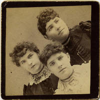 Sepia-toned image of three young women, apparently sisters. All three wear their hair pulled back and have curly bangs hanging over their foreheads. Their simple, beaded choker necklaces also match. Two wear dark dresses with puffed sleeves; one has a white lace collar while the other has a black lace collar and an elaborate braided and buttoned trim down the front of her dress. The girl in front wears a white blouse with an elaborate lace ruffle gathered about her neck. The photographer, Harry Crosley, was the son of the local Forest Grove postmaster and had his studio above the post office. It is possible at least two of the young women pictured are the McLin sisters, Martha (Emerick), and Mary Ellen (Rowen), but the style of clothing worn by the subjects and the known information about the photographer indicates the pictures was taken sometime in the 1890s, when both women would have been in their thirties.